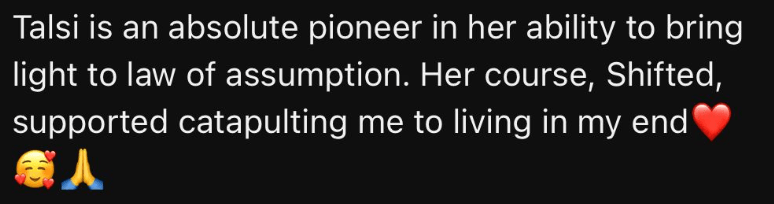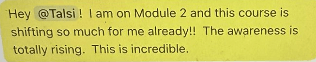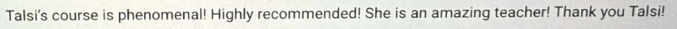 "What I have learned from you has changed my life forever. Thank you for the work you do Talsi"